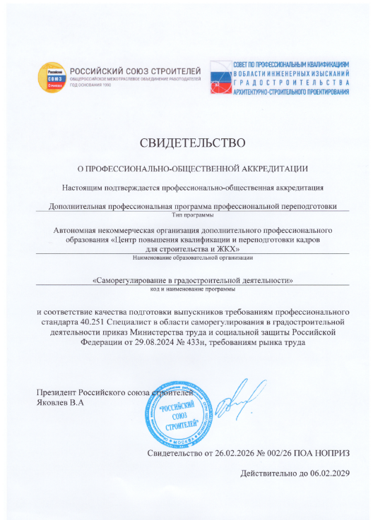 Программа реализуется в рамках сетевого взаимодействия с учебным центром Российского союза строителей, согласована Национальным объединением изыскателей и проектировщиков и Национальным объединением строителей и прошла профессионально-общественную аккредитацию в Российском союзе строителей.